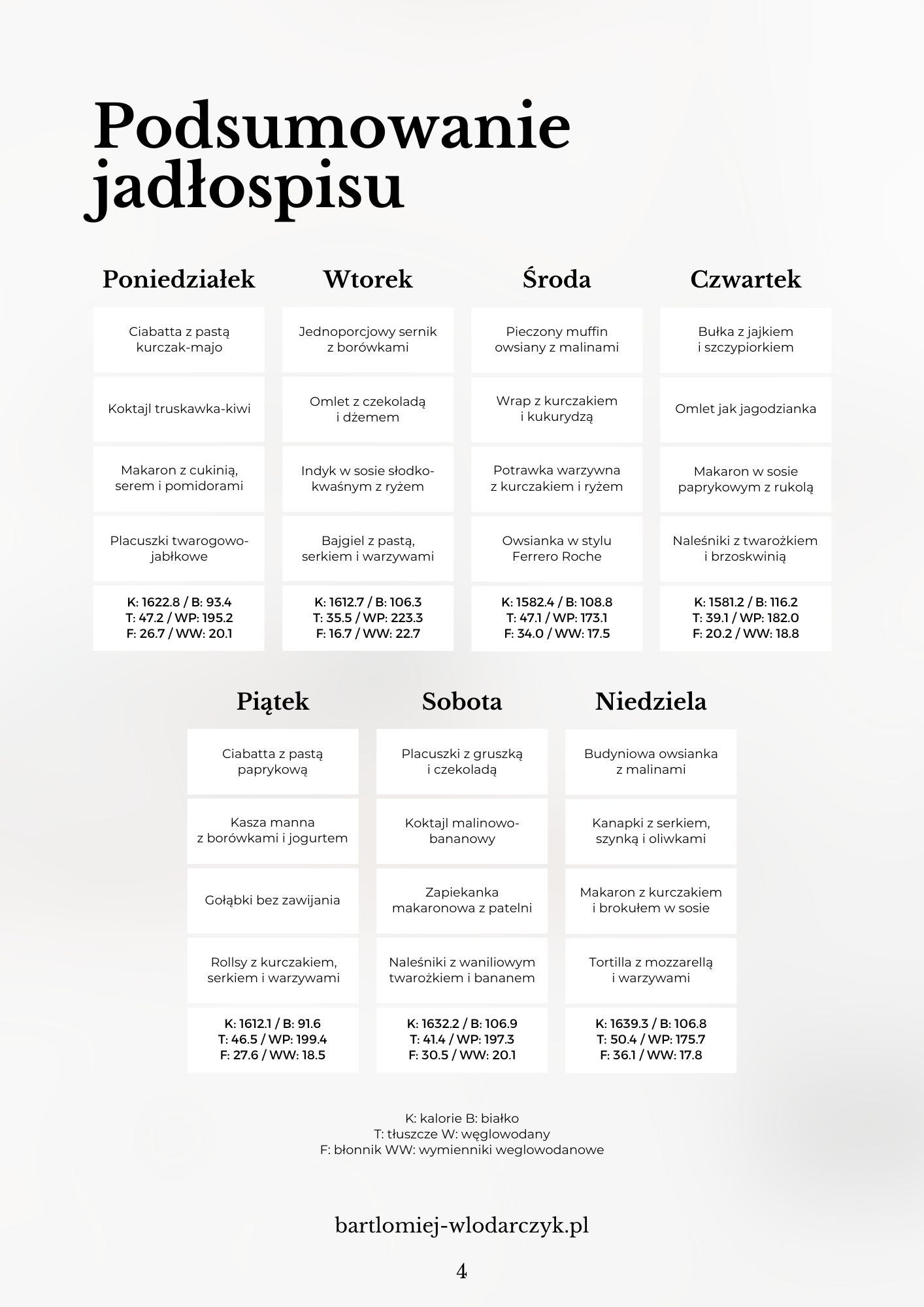 - Konkretną liczbę kalorii oraz makroskładników z podziałem na białko, tłuszcze i węglowodany przy każdym posiłku oraz w podsumowaniu każdego dnia